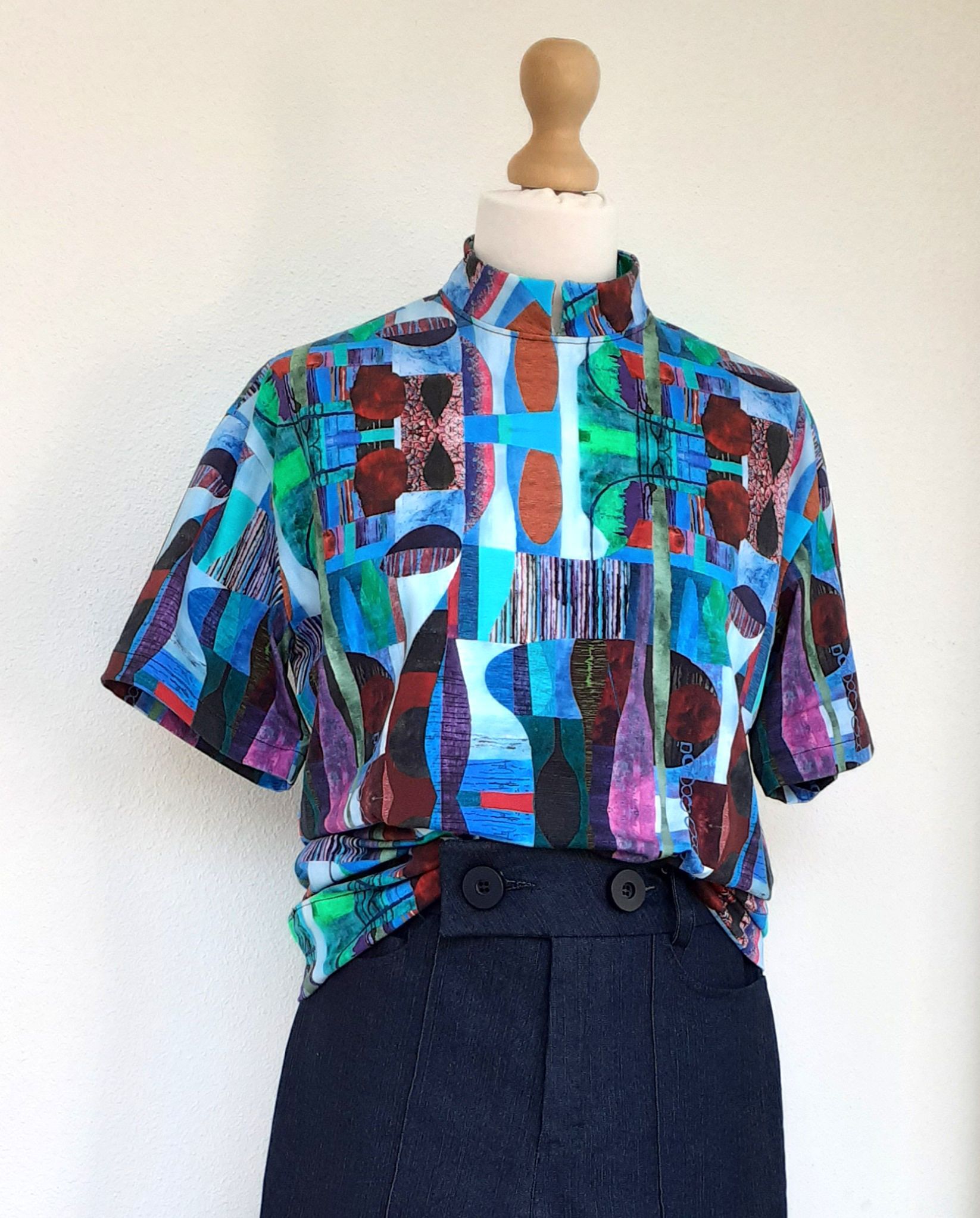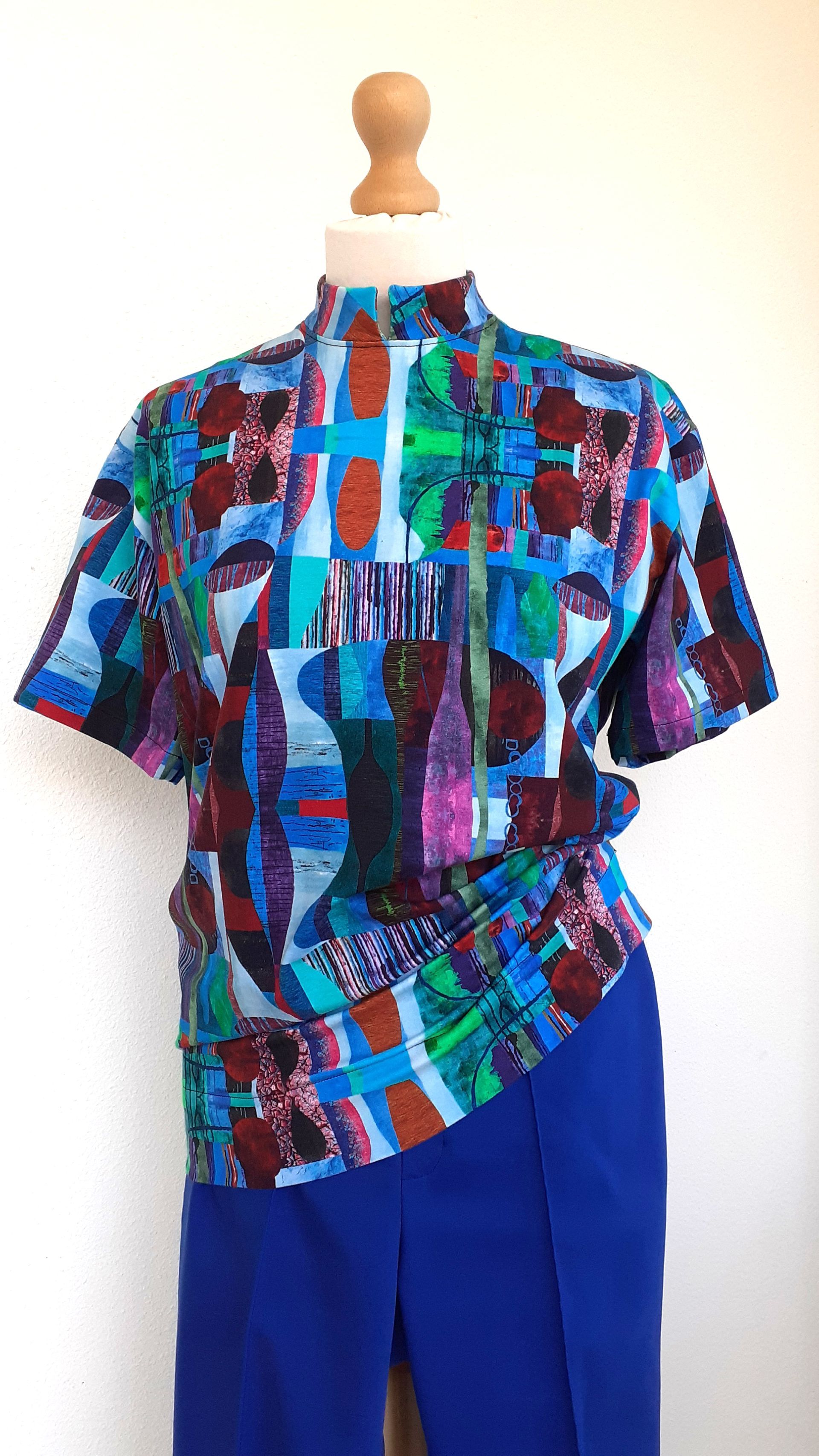 Een wijd T-shirt met opstaand boordje kan gerealiseerd worden door te werken met elastisch garen van Gütermann. Door dit garen te gebruiken in combinatie met de stoffen van Stenzo Texiles, die bestaan uit katoen en elastaan, zit er voldoende rek in de boord om deze zonder sluiting over het hoofd te kunnen aantrekken. Door de wijdte van het shirt is dit model zeer comfortabel in het dragen. En bijzonder koel op de warme dagen.