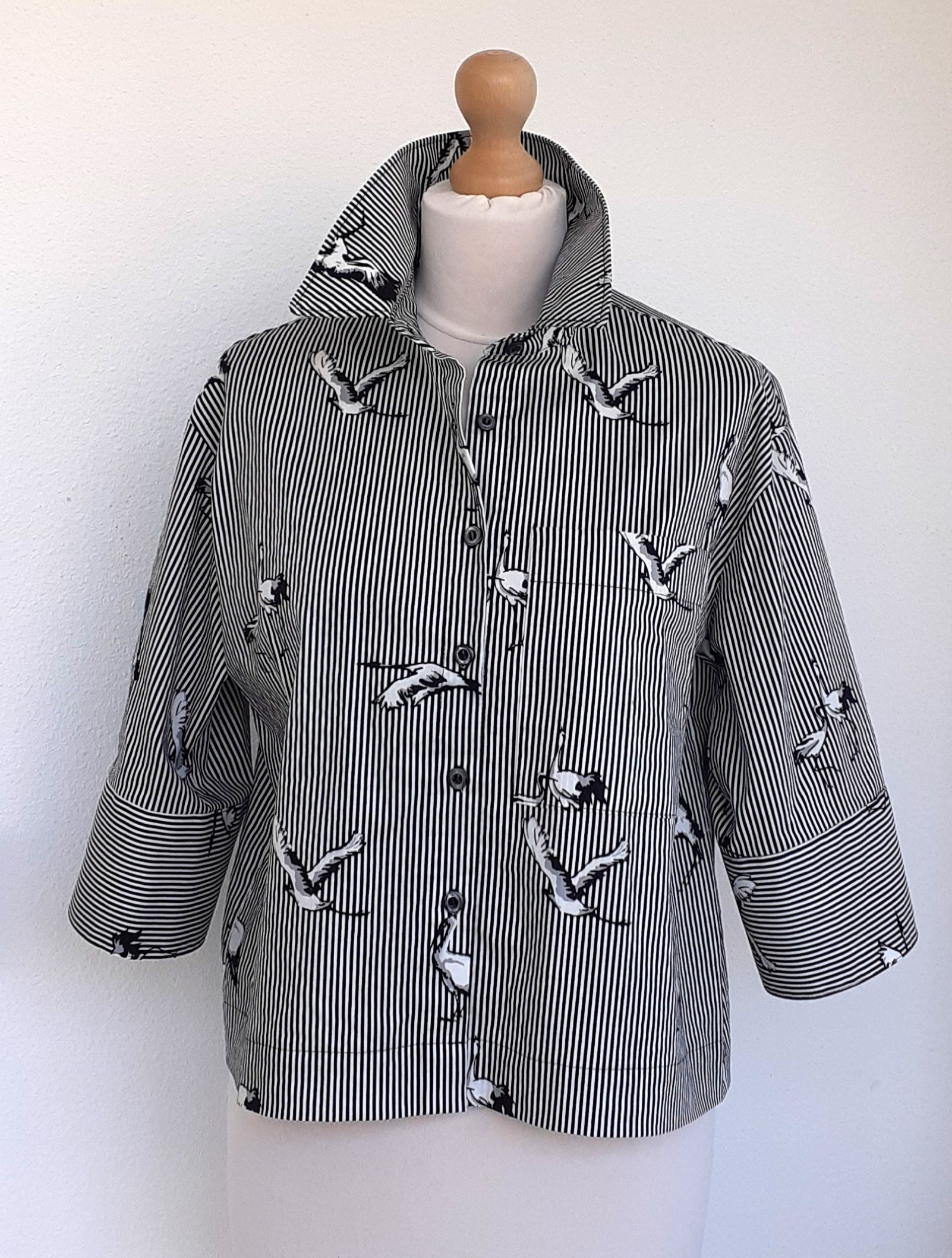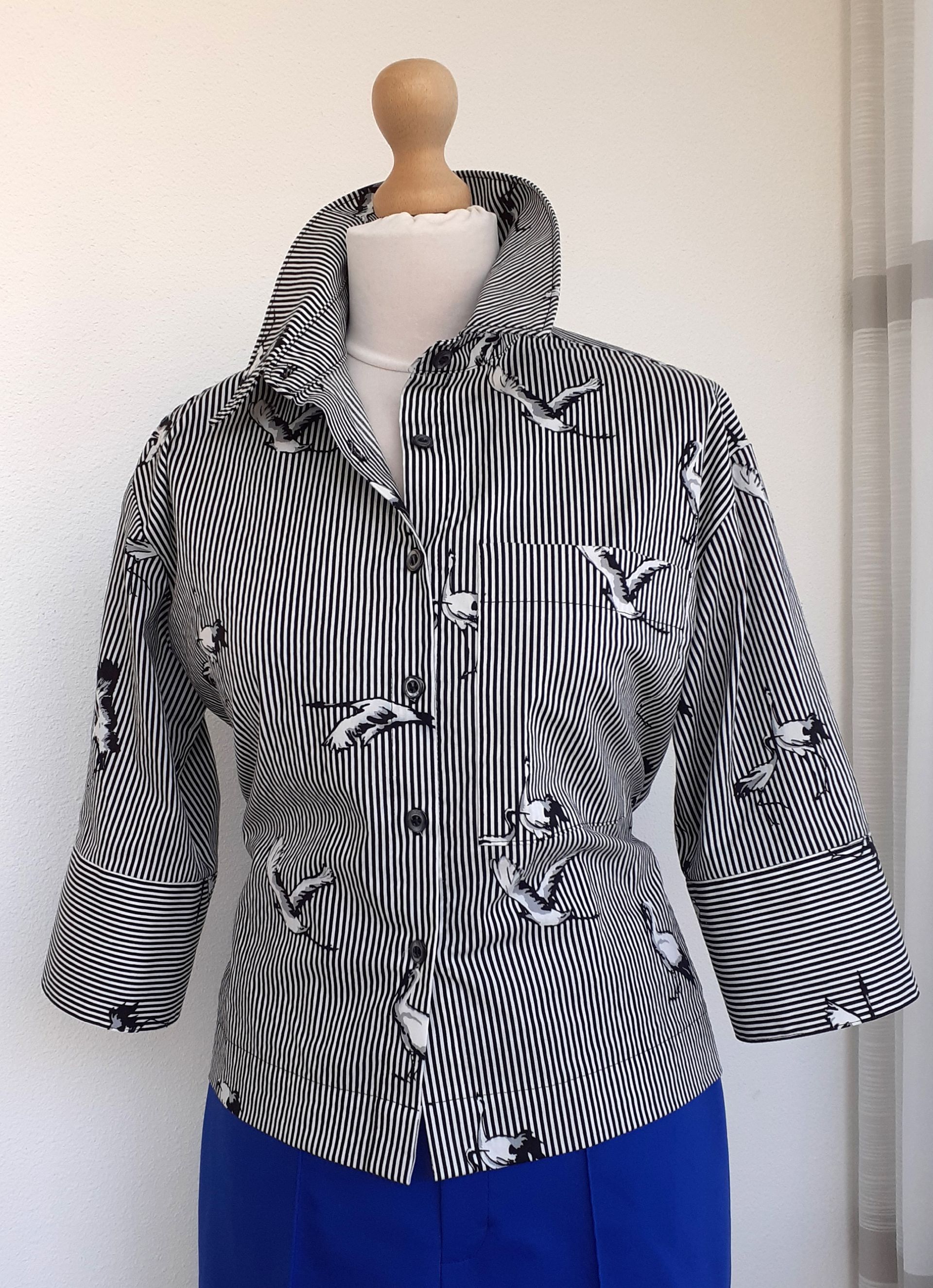 Deze blouse/jas heeft een dubbele rits die aan twee kanten sluit en opent. Er is een rose/rode draad door de tandjes geregen. Door gebruik te maken van deze rits krijgt de blouse meerdere mogelijkheden in dragen en combineren. De middenachterlengte van de blouse is 70 cm en het achterpand loopt in de zijnaden door in het voorpand. De mouwen vallen in de ellebogen en hebben een dubbele omslag. De stof is een wat dikkere viscose/katoen met elastaan in keperbinding en rekt zowel in de lengte als in de breedte.