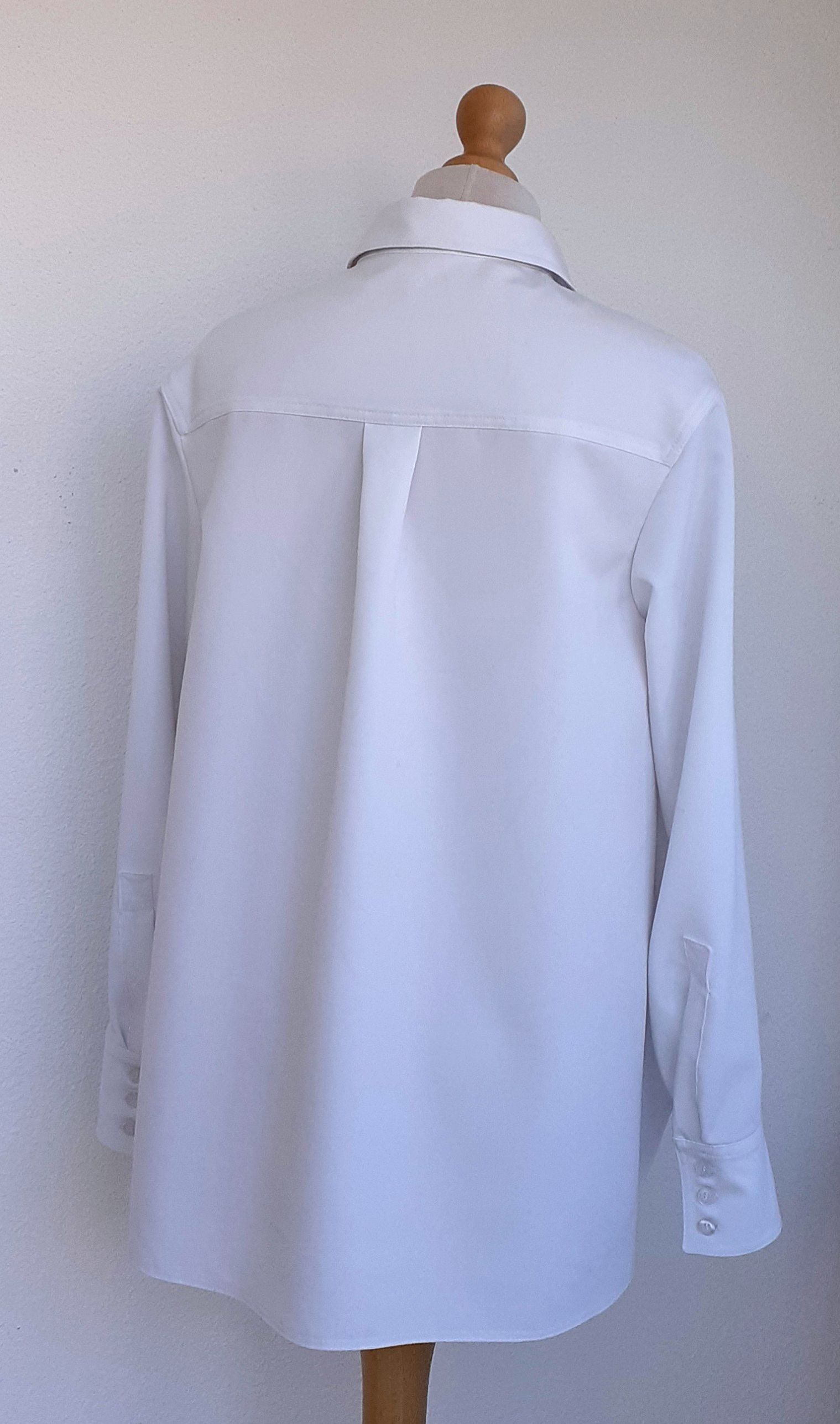 Een soepel vallende, wijde blouse van viscose, polyamide en elastaan met een plooi aan de voor- en achterkant. De manchetten en overhemd kraag zijn met een plakkatoen verstevigd en sluiten met kleine overhemdknoopjes. Het achterpand van de blouse loopt aan de zijkant door in het voorpand waardoor hij een mooie valling krijgt.