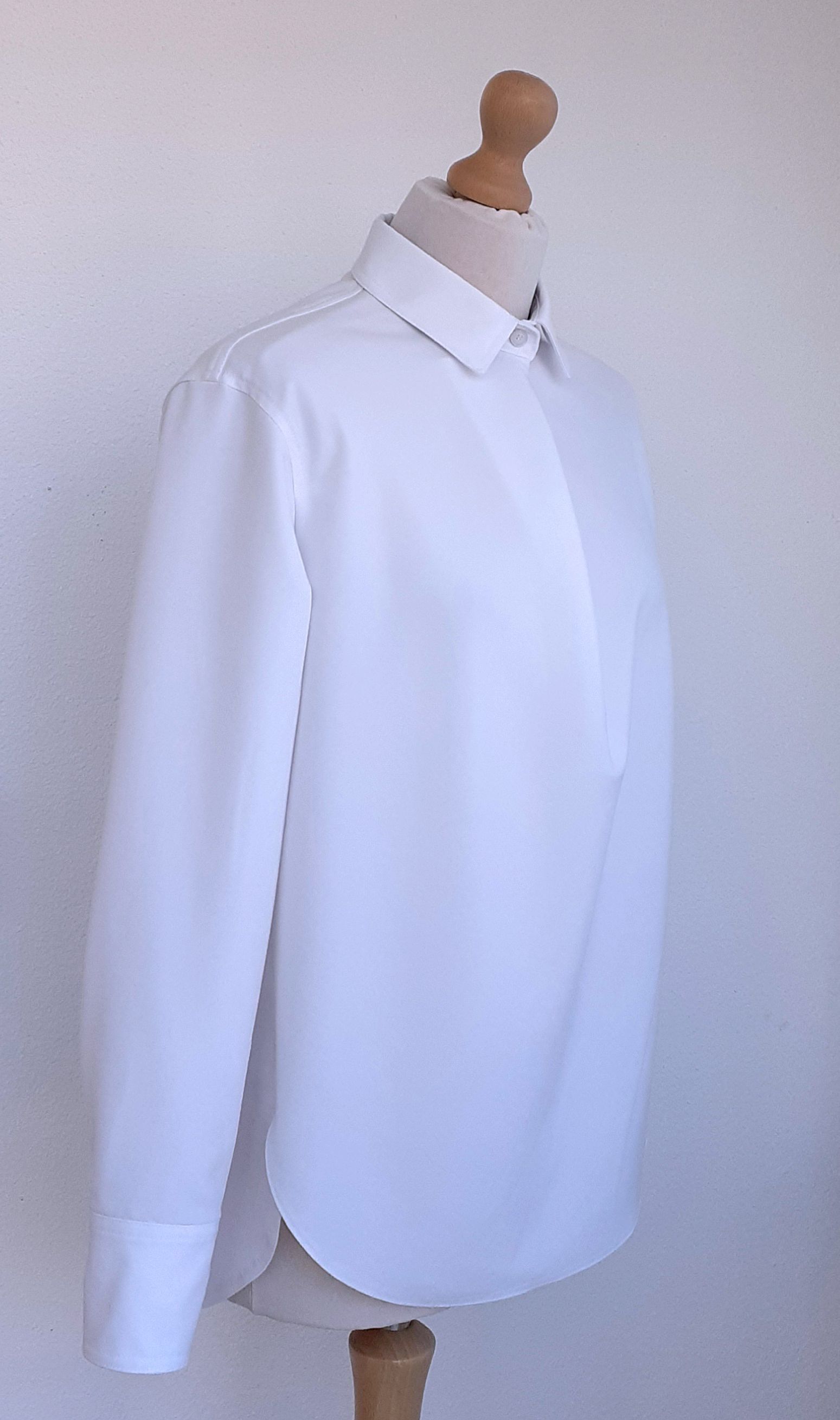 Het opstaande boordje is afgerond aan de voorkant en het shirt sluit aan op de heupen.