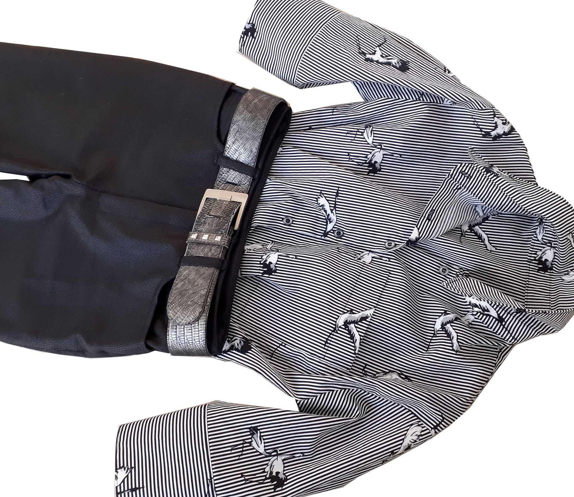 Voor een speciale gelegenheid een nachtblauw pak. De broek heeft bandplooien en een pintuck en is extra wijd. Hij sluit hoog in de taille en heeft een brede band met lussen zodat er een brede riem om gedragen kan worden. Het jasje is ruim , enigszins getailleerd en sluit met een grote bijzondere knoop. Klepzakken op taille hoogte accentueren de belijning. De brede revers geven een chique uitstraling. De stof is een cool wool en draagt heerlijk licht. Zelfs op warme dagen draagt dit kostuum heel lekker! De stijlvolle witte blouse met plooi maakt dit pak helemaal af.